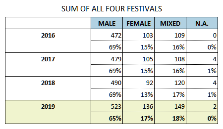 - However, some festivals’ transitions show possible intentions to reduce the male ratio.