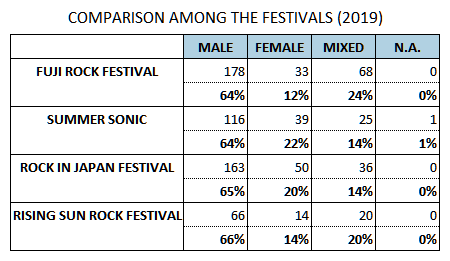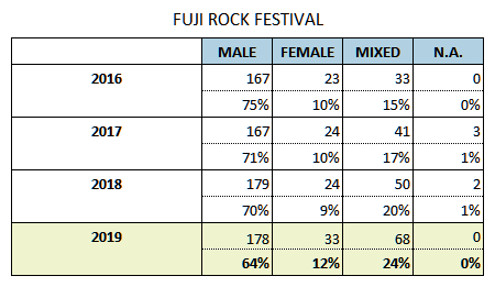 As seen above, Japan’s gender equality in the festivals’ lineup seems a bit better than the US. There might be many explanations for this, but I don’t have any clear opinion now.