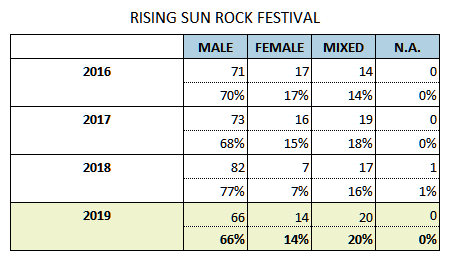- The festival that included the least female acts in 2019 was Fuji Rock Festival (12%).
