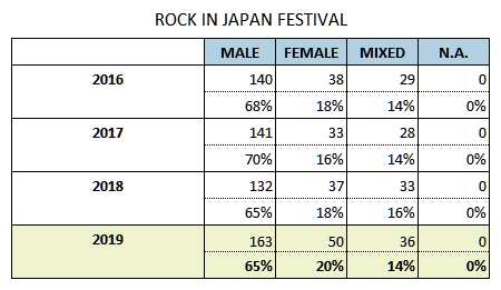 - In 2016, Fuji had 75% male acts and Rock In Japan did 68%. On the other hand, in 2019, the former was 64% (11 points lower) and the latter was 65% (3 points lower).