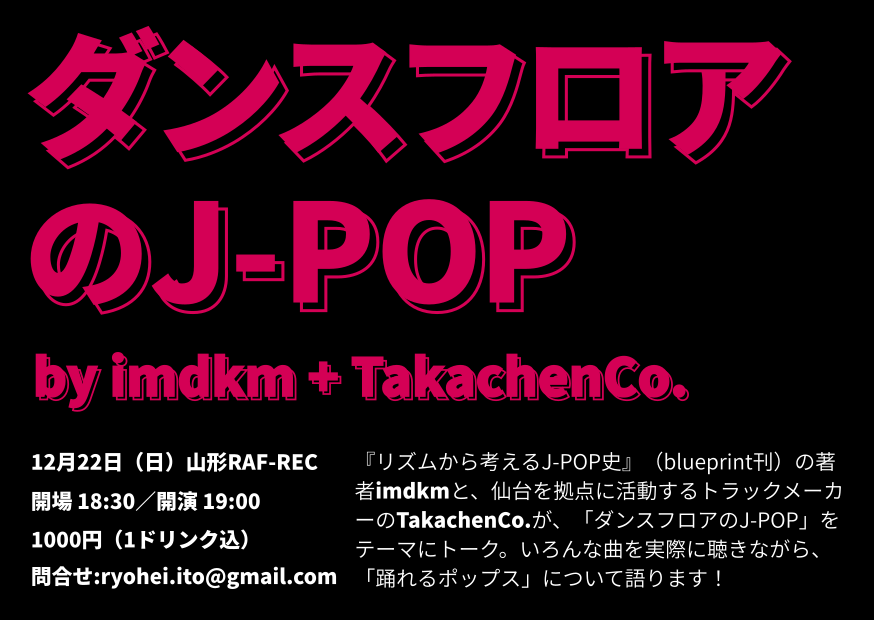 この度、『リズムから考えるJ-POP史』刊行記念トークイベントとして、「ダンスフロアのJ-POP by imdkm + TakachenCo.」を12月22日(日)に山形RAF-RECにて開催します。