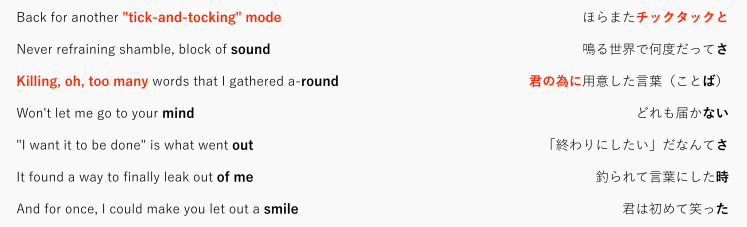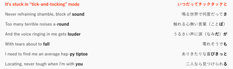 Bメロでは最初の一行がまず"It’s stuck in “tick-and-tocking” mode"と「いつだってチックタックと」で音がかなり近い。空耳だ。しかもここは内容もかなり近い。っていうか"tick-and-tocking"ってもろだし。ただ、“tick-tock"とは言っても"tick-and-tocking"ってそんな言うのかわからない。だからあえてダブルクォーテーションでくくってあるんだろう。進行形にして動名詞化してあるのもふくめて、「チックタック」と無声音が有声化している日本語の発音と辻褄を合わせるために工夫してある。