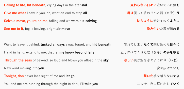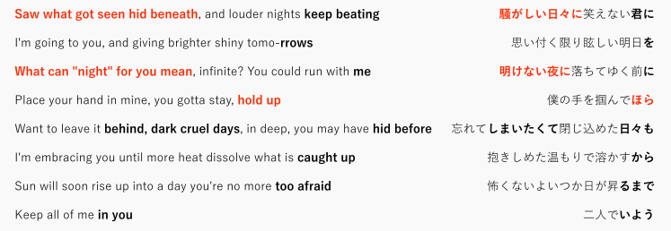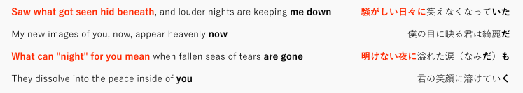 そして最初のサビ。「騒がしい日々に」が"Saw what got seen hid beneath"となってかなり空耳。意味も直訳ではない(し、楽曲のイメージを汲んだうえでの創作という感じ)。一行開けて「明けない夜に」が"What can “night” for you mean"は空耳度はやや落ちるもののかなり空耳。「ほら」が"hold up"なのは黒太字でもいいのだけれども、サビの後半につないでタメる重要なフレーズであり、かつ意味もそこまで遠くない(「ほら」だとまだ手を掴んでない「君」に呼びかけているみたいだけど、“hold up"だともう掴んでる感じではある)。