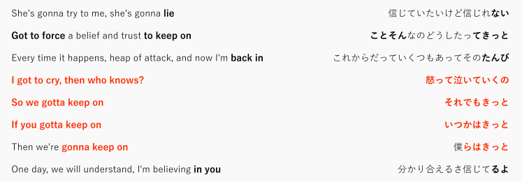 ここの「それでもきっと いつかはきっと 僕らはきっと」を"gotta keep on"の畳み掛けで再現しているのが面白い。空耳度はそこまで高くないけど。発音記号で比べたら一致していないだろうけど、日本語の「っ(促音)」がつくるアクセントと英語の強弱アクセントをうまく一致させて、聴いてる感じはかなり近いものにしてあるというか……(知らんけど……)。