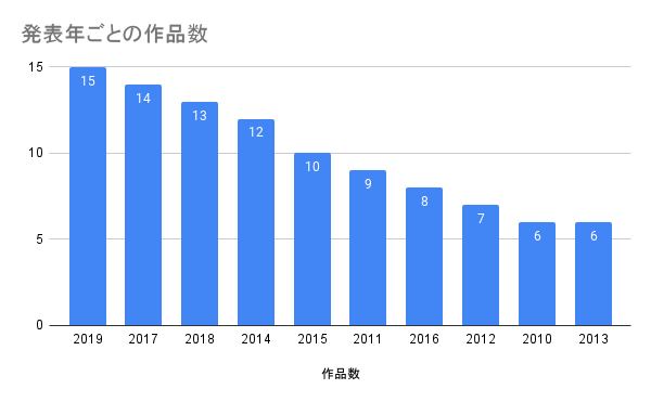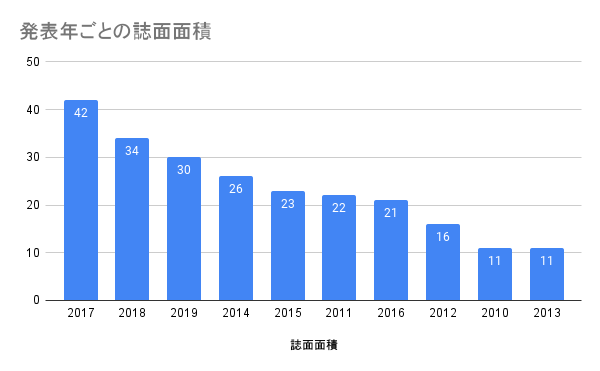 というのをふまえてグラフを見ていく。単純に作品数で言えば最多は2019年(15作)であり、以下2017年(14作)、2018年(13作)と2010年代末の3年間が連なる。一方で誌面面積を見ていくと、2017年が逆転して最大になり、ついで2018年(34)、2019年(30)と続く。いずれにしてもこの3年間に評価された作品が集中していることは間違いなく、見方によっては2017年が(ミューマガ的には)もっとも豊作だった、のかもしれない。