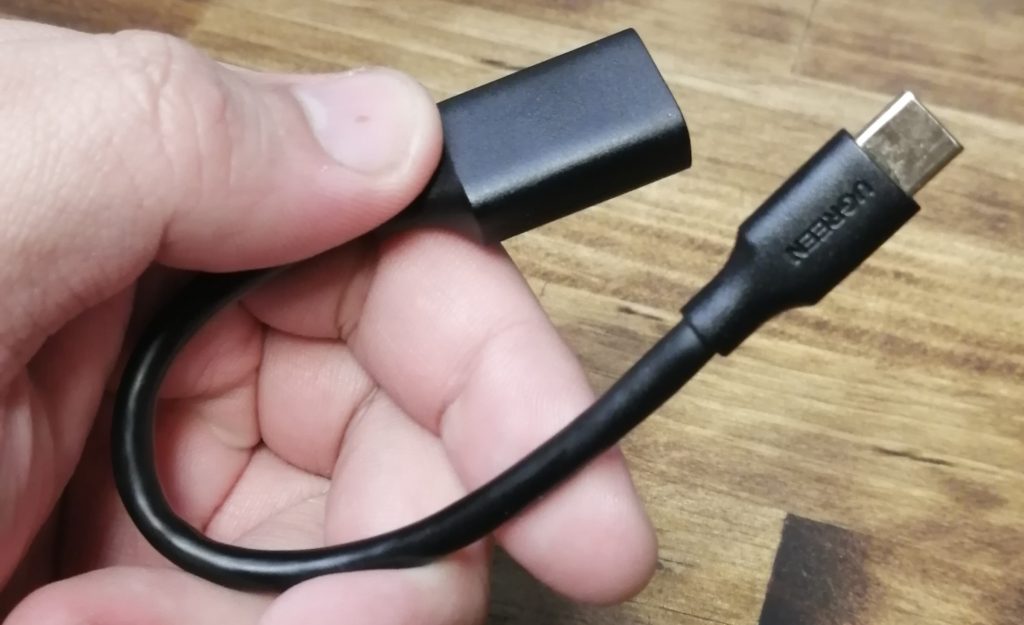 スマホはHuawei P30 Liteで、エントリークラスの格安スマホの部類に入る。入力端子はUSB Type-Cのみ。UCA/UFOは一般的なUSB端子(いわゆるType-A)なので、変換プラグやハブなどが必要になる。今回はたまたま持っていた変換ケーブルを使った(アフィリンク注意)。
