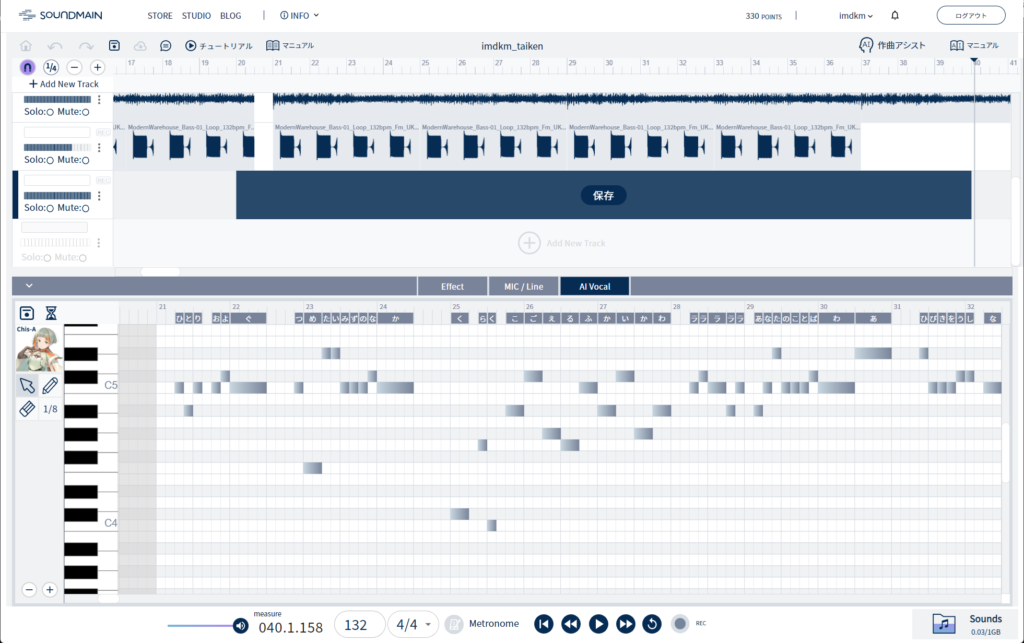 打ち込んだら、「保存」をクリック(AI Vocalエディタの左上アイコンか、タイムライン上の「保存」ラベル)すると音声にレンダリングされます。一度「うわ、間違って編集中なのにレンダリングしちゃったよ!」と焦ったんですが、レンダーされた波形を右クリックすると再度編集をすることができます。よかった。