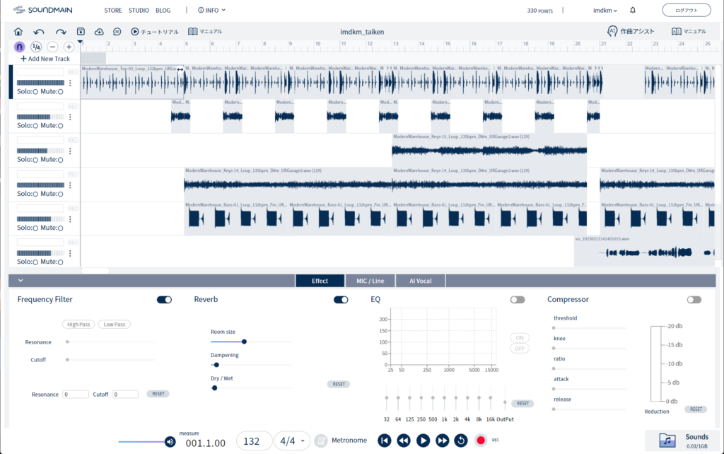 Soundmain Studioは、主にサンプルファイルのエディットを中心とした機能を提供しているブラウザで動作するDAWです。サンプルの配置、カット&ペースト、タイムストレッチ、ピッチシフトといった基本的な編集に加え、各トラックごとにレベルの調整や、ハイパス/ローパスフィルター、リヴァーブ、EQ、コンプレッサーといったエフェクトで音色を変えることもできます。