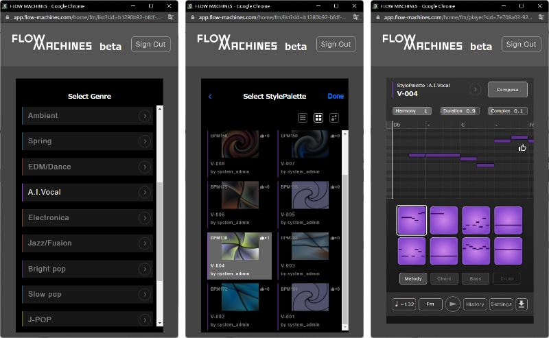 使い方は簡単。ジャンルを選択し、ジャンルごとに用意されているスタイルパレットからイメージに近いスタイルを選択。最後にピアノロールと演奏を実際に聞きながらパラメーターを調節し、素材を生成します。ここではメロディだけ使いましたが、バッキングのコードやベースライン、ドラムのパターンも生成できるようです。MIDIファイルを出力できるので、ここで生成した素材をふだんづかいのDAWに流用することも可能です。